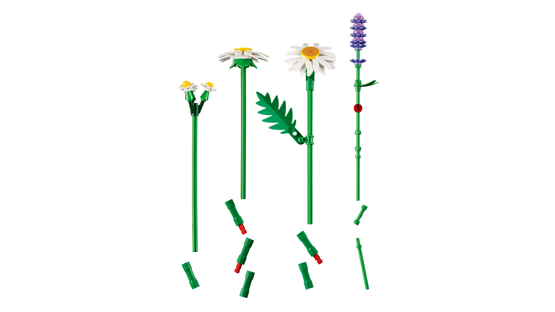 - LEGO® FLOWER BOUQUET – Budding florists will have fun building 3 large daisies, 2 stems of small daisies, 3 calming sprigs of lavender and vibrant green stems